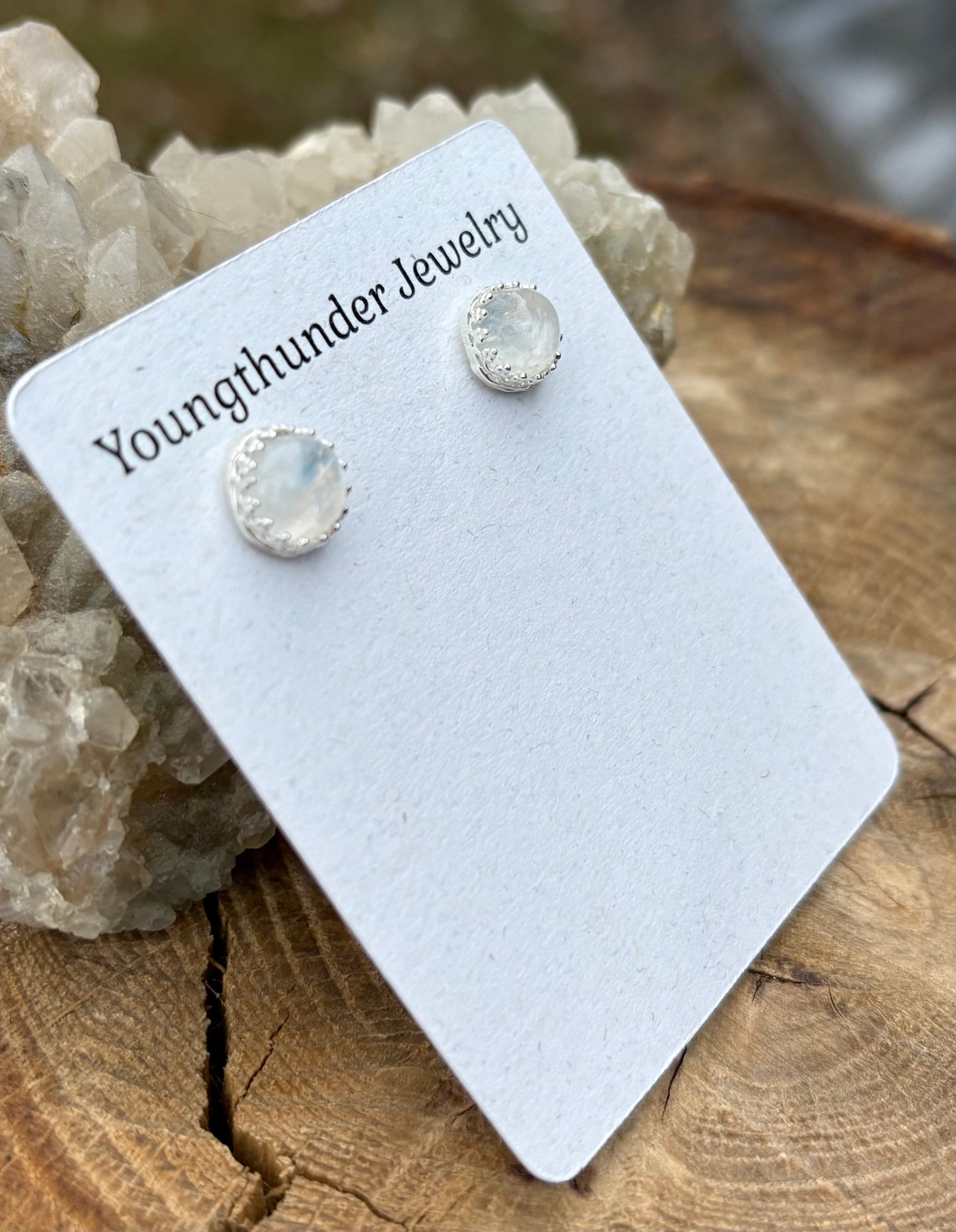 Moonstone cabochons set in Fine Silver. This pair has a really pretty blue flash. Pics do not do it justice!